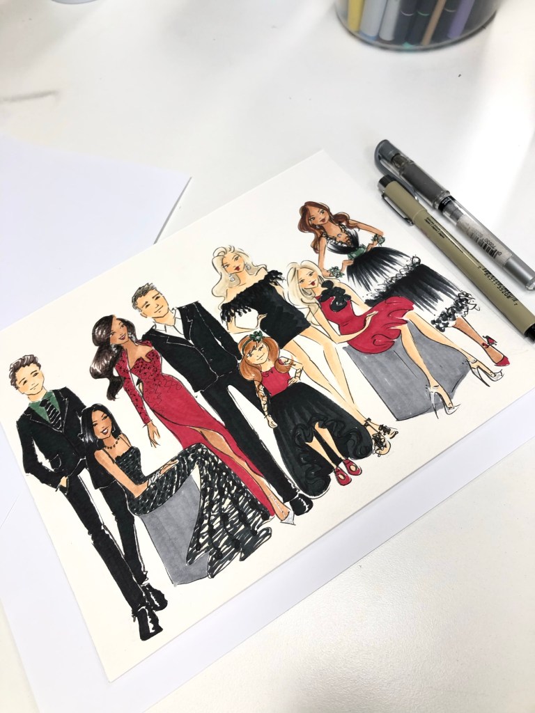 Average sketch (full body with color) per guest takes several minutes, depending on the complexity of outfits. Paper is cold pressed watercolor paper, typically sized 8×10 inches. Alternatively, 4×6 inches may be requested as well. Or, Client may provide their own card stock paper with logo or unique sizes if desired. Guests receive their sketch in a sheet protector sleeve.